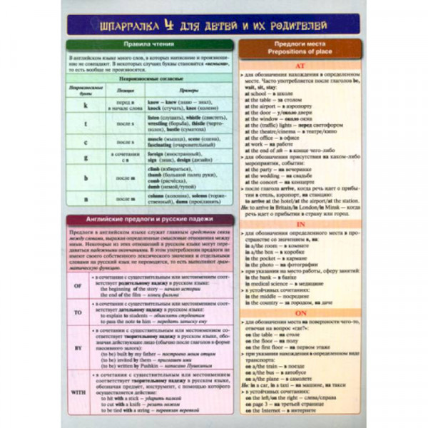 Шпаргалка имеет следующие справочные материалы: правила чтения, английские предлоги и русские падежи, предлоги места Prepositions of place, прилагательные Adjectives, степени сравнения Degrees of Comparison, наречия, сочетания прилагательных с предлогами.