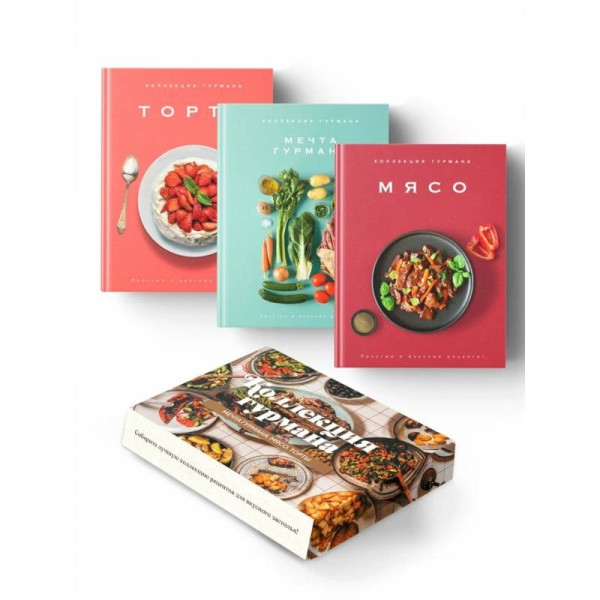 Соберите лучшую коллекцию рецептов для вкусного застолья! Внутри вы найдете блюда, идеально подходящие как для больших посиделок, так и для вашего личного ужина. «Мечта гурмана» погрузит вас в мир высокой кухни благодаря изысканным рецептам и красивым фотографиям. С помощью книги «Мясо» вы сможете приготовить не только вкуснейшие фрикадельки, митболы и шашлычки. Но и неожиданные соусы и маринады для них. А в завершение пира порадовать себя шифоновым, лимонно-миндальным или королевским тортом, рецепты которых вы найдете в книге «Торты».