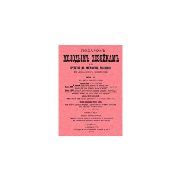 Репринт с самого полного 22-го издания. СПб., 1901. Доптираж. В двух частях. Содержит 7 отделов, 4 реестра скоромных обедов, более 2000 описаний разных блюд, более 1000 описаний приготовления разных запасов (фруктовых, овощных и мясных, разного печенья, варенья, наливок, сыра, уксуса, крахмала, масла и пр.), стол вегетарианский, постный стол с реестром постных обедов, образцы сервировки стола и блюд (с рисунками). В книге более 4000 рецептов для семей различного достатка, полезные советы по заготовке и хранению продуктов.