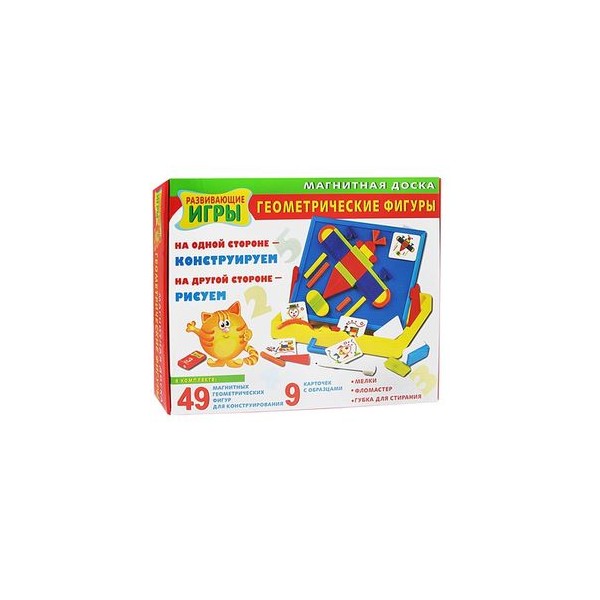 Развивающая игра магнитная доска геометрические фигуры. На одной стороне -конструируем, на другой стороне -рисуем. В комплекте: 49 магнитных геометрических фигур для конструирования, 9 карточек с образцами, мелки, фломастеры, губка для стирания.
